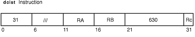 The dclst instruction has one syntax form and does not effect the Fixed-Point Exception register. If the Record (Rc) bit is set to 1, Condition Register Field 0 is undefined.