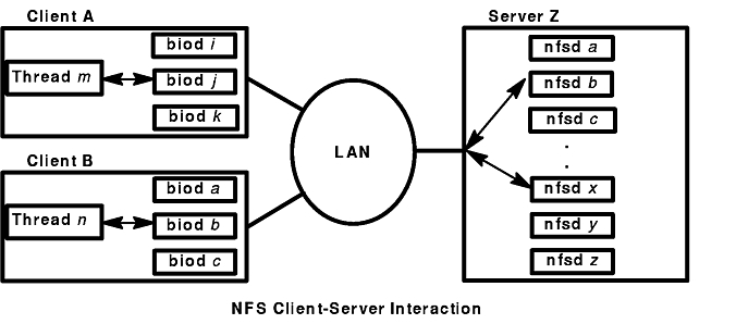 The figure "NFS Client-Server Interaction" illustrates the structure of the dialog between NFS clients and a server. When a thread in a client system attempts to read or write a file in an NFS-mounted directory, the request is redirected from the normal I/O mechanism to one of the client's NFS block I/O daemons (biods). The biod sends the request to the appropriate server, where it is assigned to one of the server's NFS daemons (nfsds). While that request is being processed, neither the biod nor the nfsd involved do any other work.