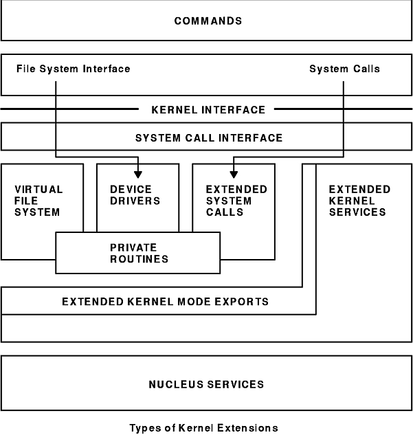 The Types of Kernel Extensions diagram illustrates the addition of extensions to the kernel environment.