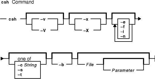 csh [ -v | -V ] [ -x | -X ] [ -e ] [ -f ] [ -i ] [ -n ] [ -c String | -s | -t ] [ -b ] [ File [ Parameter ] ]
