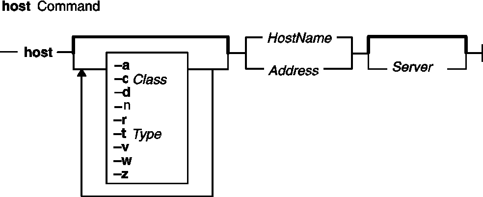 host [ -a ] [ -c Class ] [ -d ] [ -n ] [ -r ] [ -t Type ] [ -v ] [ -w ] [ -z ] [ Hostname | Address ] [ Server ]