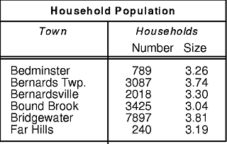 .TS center box ; cB s s cI | cI s ^ | c c l | n n . Household Population _ Town@Households @Number@Size = Bedminster@789@3.26 Bernards Twp.@3087@3.74 Bernardsville@2018@3.30 Bound Brook@3425@3.04 Bridgewater@7897@3.81 Far Hills@240@3.19 .TE