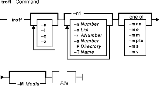 troff [ -a ] [ -i ] [ -q ] [ -z ] [ -F Directory ] [ -n Number ] [ -o List ] [ -r ANumber ] [ -s Number ] [ -T Name ] [ -mm | -me | -mptx | -ms | -man | -mv ] [ -M Media ] [ File ... | - ]